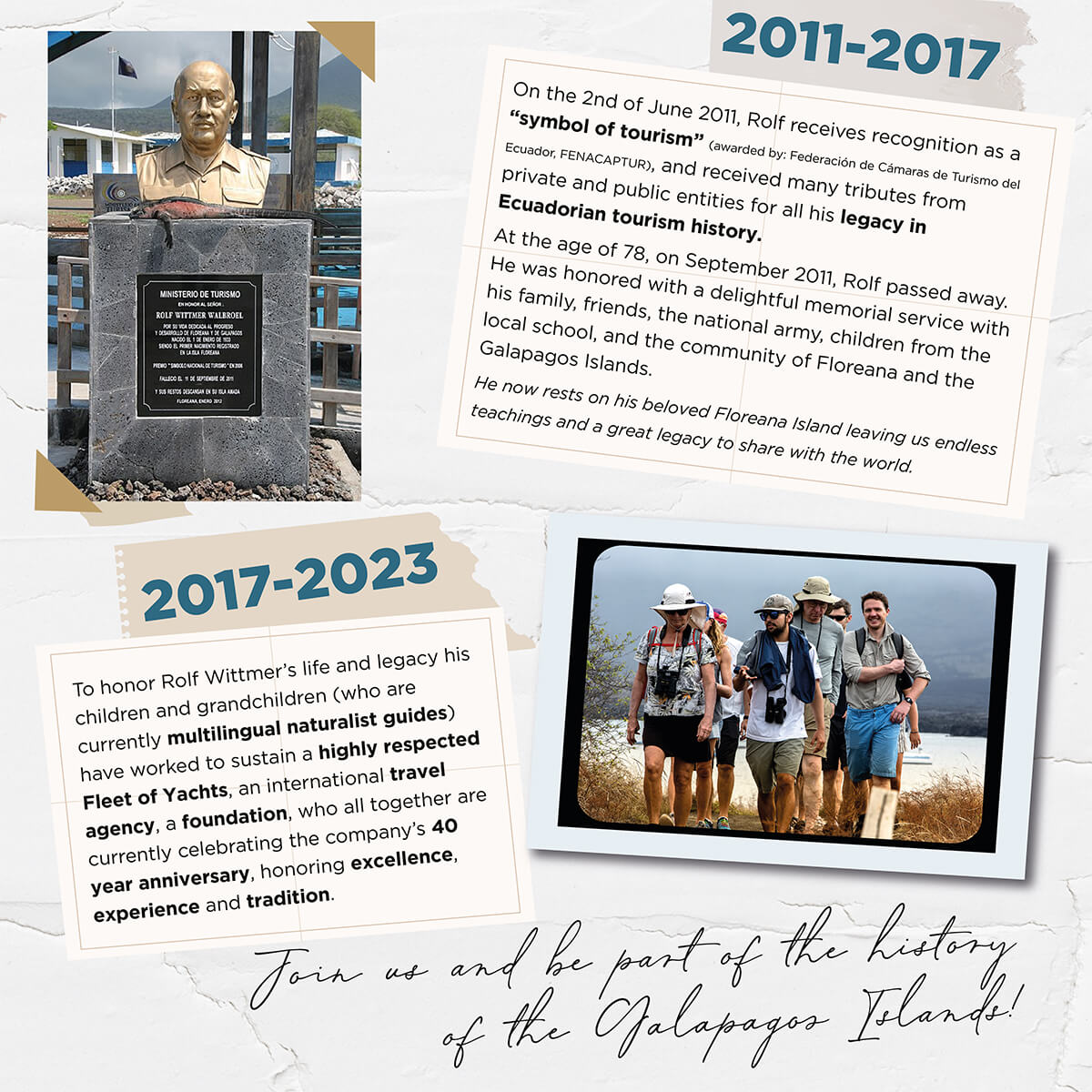 We're Rolf Wittmer Turismo Galapagos, a 100% ecuadorian family company founded in 1982 by Captain Rolf Wittmer, first man whose birth on Floreana island has been historically documented.